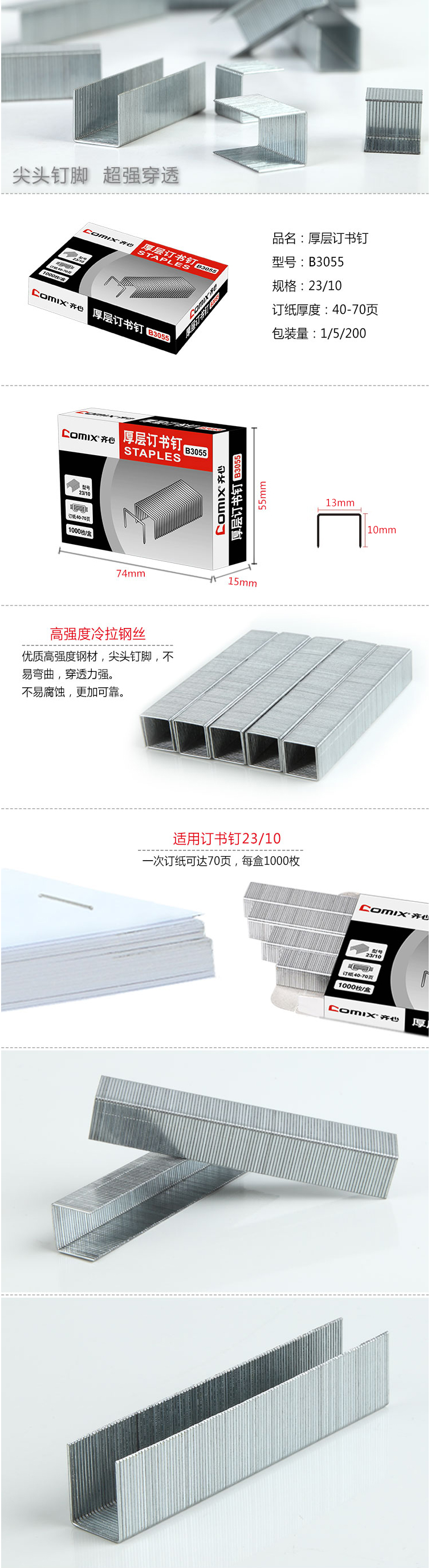 商品名稱:齊心 B3055 厚層訂書釘(23/10)70頁 1000枚/盒