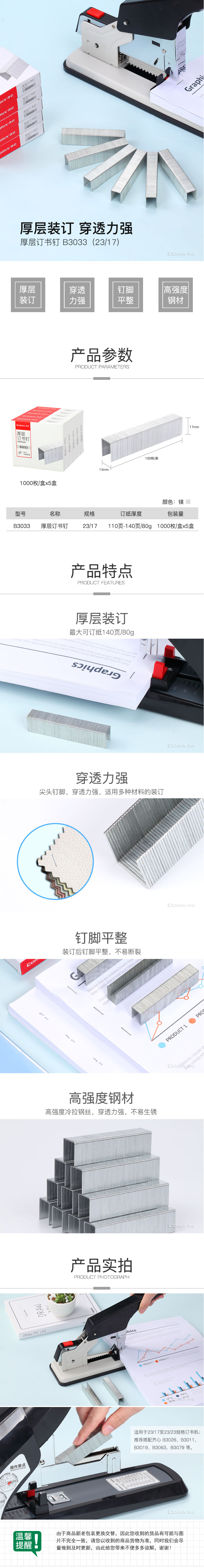 商品名稱:齊心 B3033 厚層訂書釘(23/17)140頁 1000枚/盒