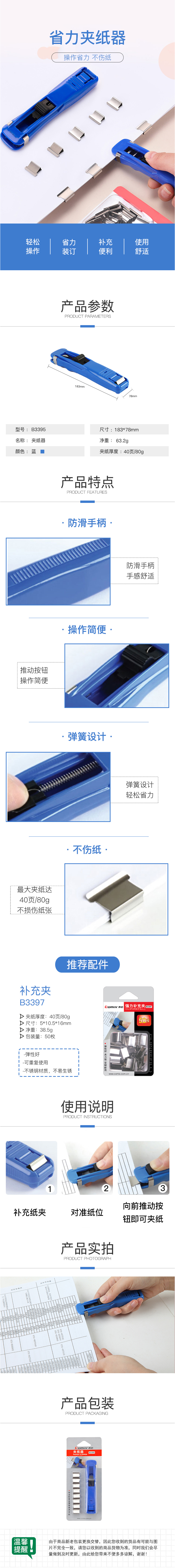 商品名稱:齊心 B3395 夾紙器/推夾器/票夾器(中號)附送8枚補(bǔ)充夾