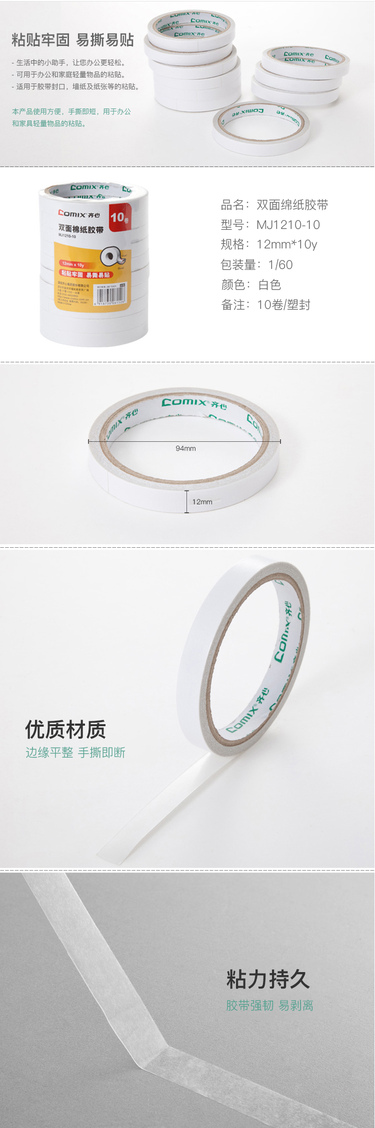 商品名稱:齊心 MJ1210-10 雙面棉紙膠帶 10卷/筒