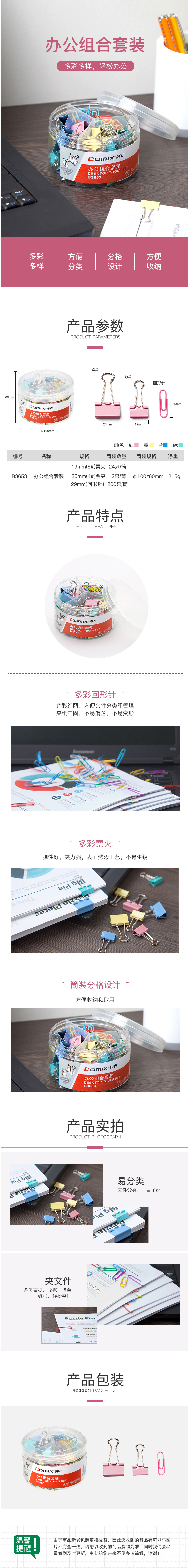 商品名稱:齊心 B3653 辦公組合套裝 4/5號票夾/29mm回形針