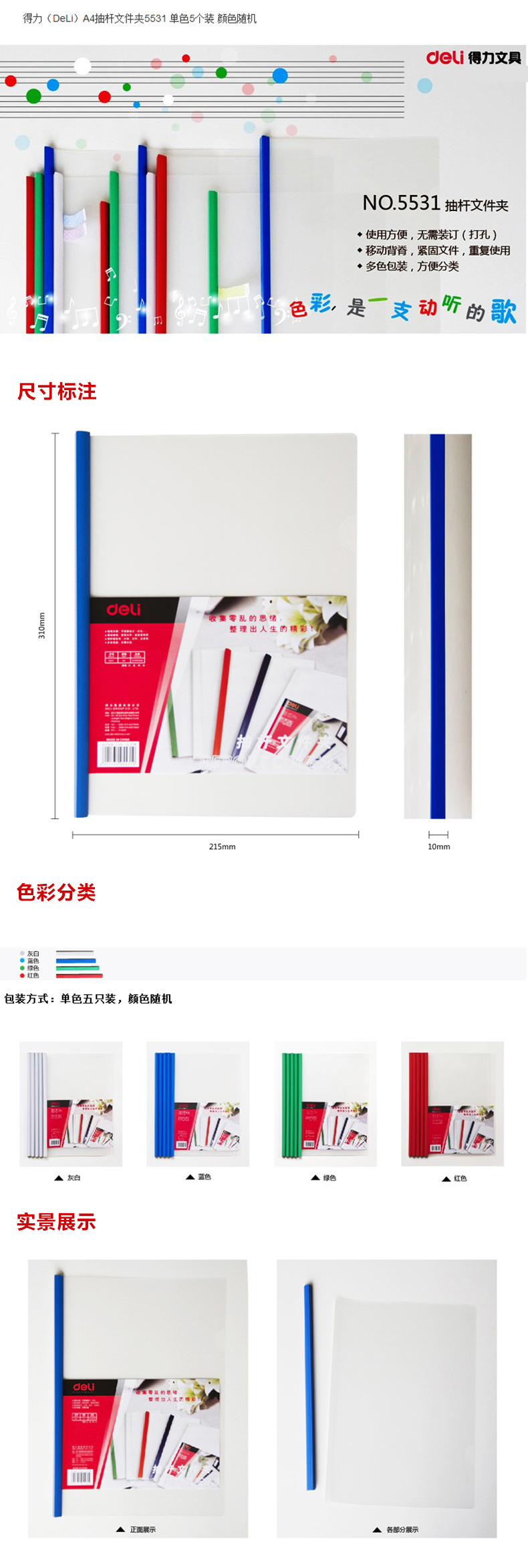 商品名稱:得力5531抽桿夾(混)(5只/包)