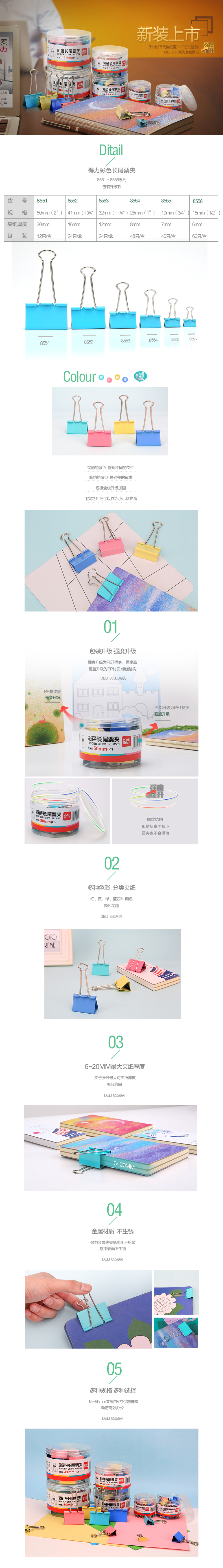 商品名稱:得力8556-6#彩色長(zhǎng)尾票夾15mm(筒裝)(混)(60只/筒)