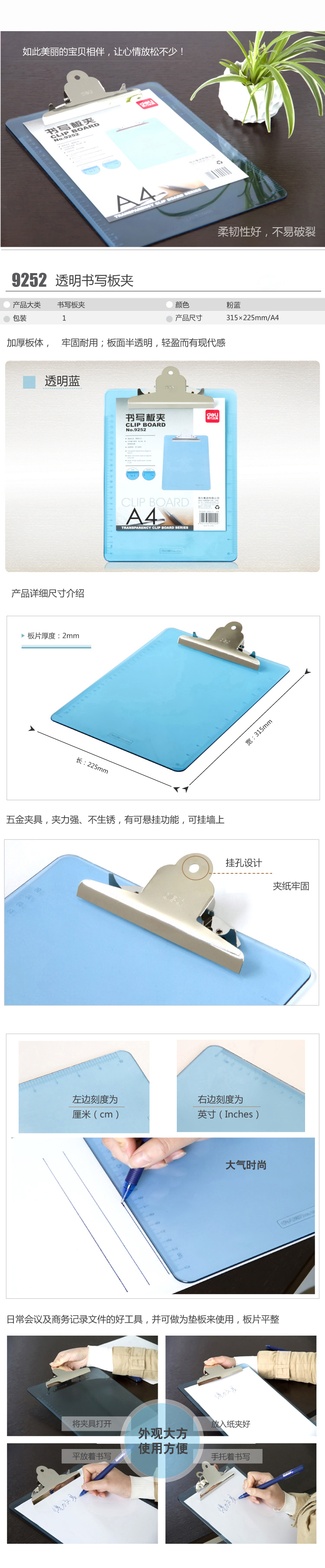 商品名稱:得力9252透明書寫板夾(淺藍(lán))(只)