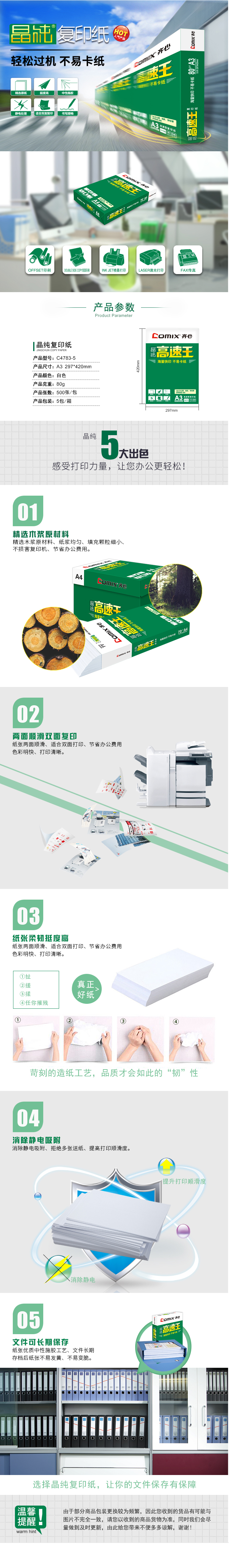 商品名稱:齊心 C4783-5 晶純高速王復印紙80克 A3 5包/件 28件/整卡板