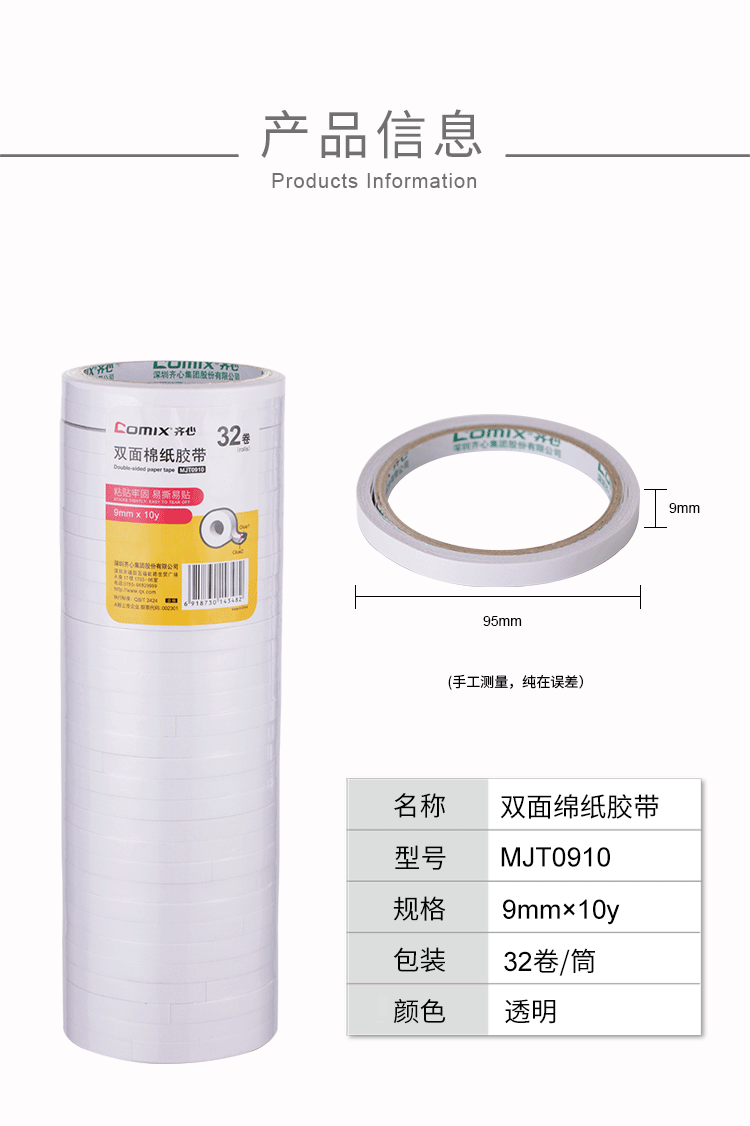商品名稱:齊心 MJT0910 雙面棉紙膠帶 09mm*10y 32卷裝