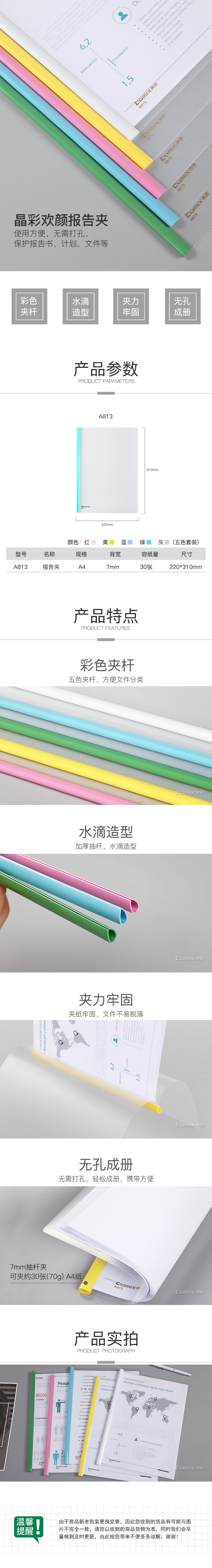 商品名稱:齊心 A813 歡顏報告夾 A4 抽桿式 30張 五色套裝