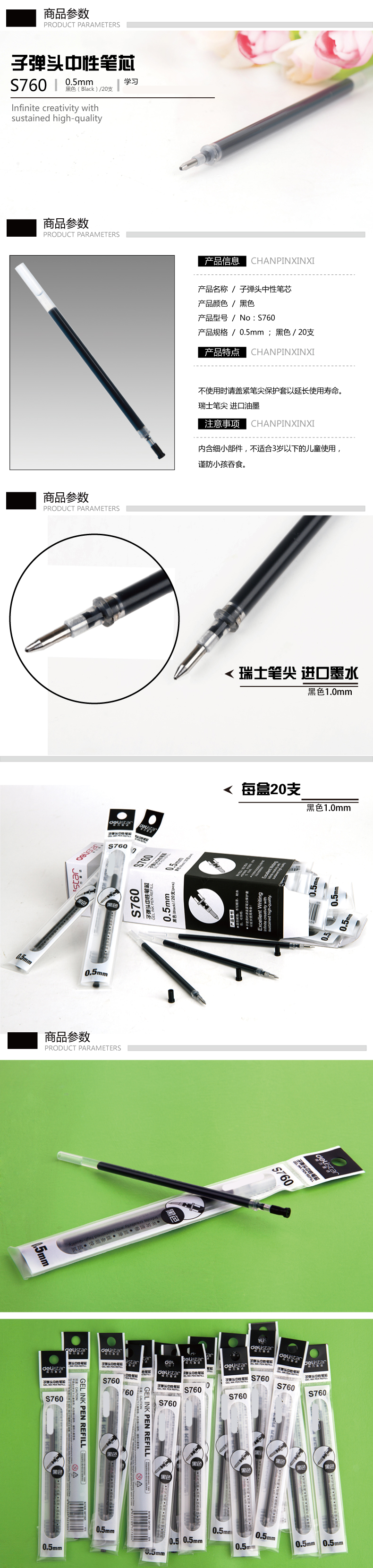 商品名稱:得力S760子彈頭中性筆芯0.5mm子彈頭(黑)(支)