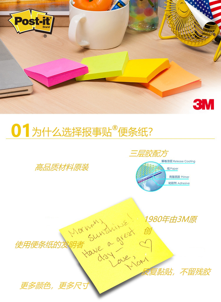 3M 便利貼 報(bào)事貼/便條紙/便簽紙/便簽本 合宜系列辦公用品 72*76 4色彩色報(bào)事貼 654B-4P